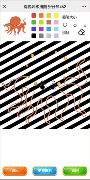 从左至右第一行,依次为参考图片、16个色块、3种画笔大小以及消除笔。中间部分是动态黑白斜条光栅,用于描画图片。最下方设有退出、更换图片、返回这3个按钮。