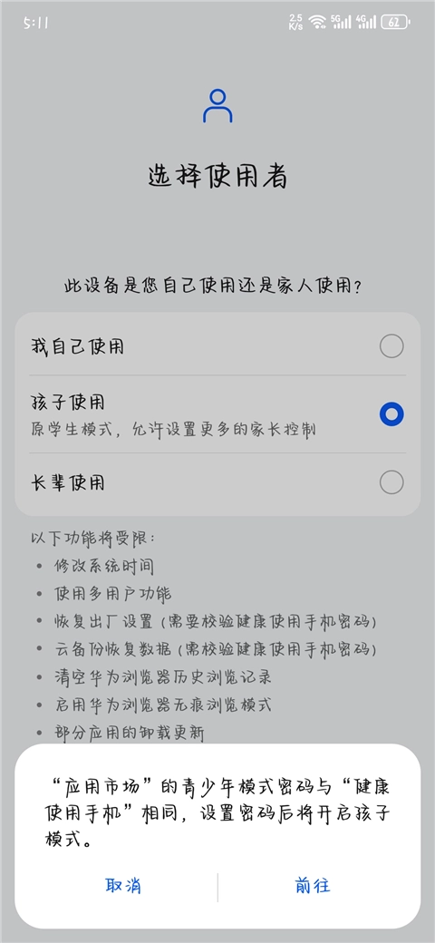 3、依据你的身份,选择以家长身份操作还是设置密码,同时设定对应的年龄限制。