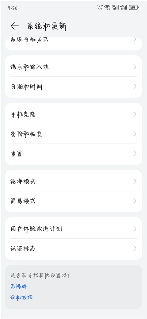 1、打开华为手机的设置中心,可在其中搜索纯净模式,也可在系统或更新选项里查找。
