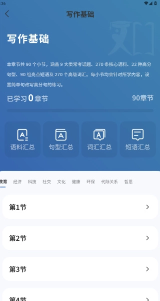 4、小白可以点击写作基础,各种语法、短句的学习教程。