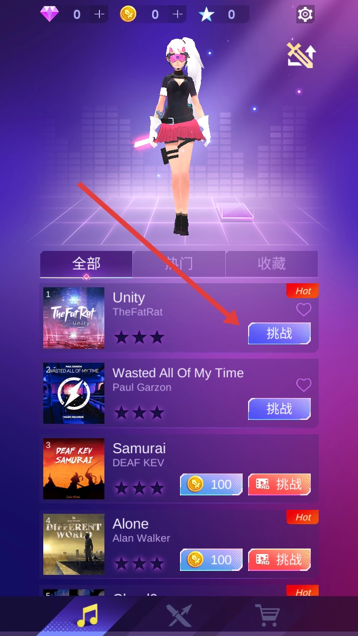 1、选Unity歌曲点挑战,进入节奏战斗,角色持光剑,随音乐节奏攻击黑色机甲敌人。