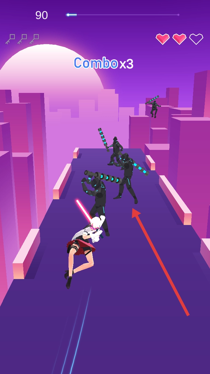 2、遇敌人如持长棍机甲,在Combox3连击时,按节奏点击屏幕,精准挥剑,躲避反击。