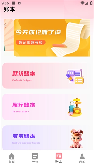 4、账本功能里包含了默认账本、旅行账本等多个分类。
