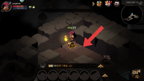 1、在洞穴场景中,需要控制角色移动,前方有敌人在阻碍收集黄金时,需要用刀把它歼灭。