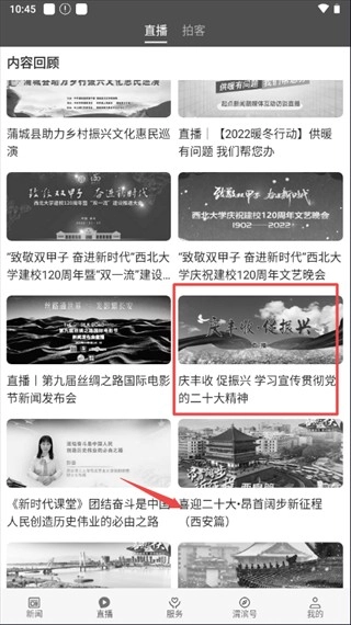 2. 点击“直播”,即可学习并观看关于党的二十大精神、新时代课堂等相关内容。