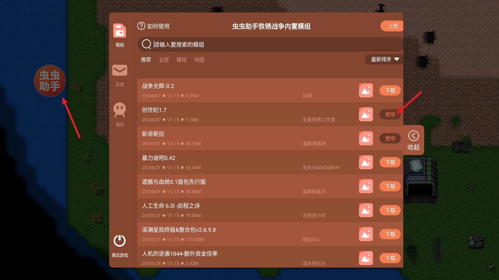1、进入游戏后点击左侧的虫虫助手图标,点开后需要使用的模组。