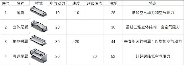 大尾翼:大幅度增加下压力和空气阻力,尾翼升级至80%后解锁。一级属性为-40速度,+40过弯。网上大多数玩家都觉得,尾翼的作用其实并不突出,故而选择放弃研究。但小编发现,其实比赛中很多地图都是比较复杂的,过弯时处理不当就会撞到墙上,或是速度下降被其他选手赶超。