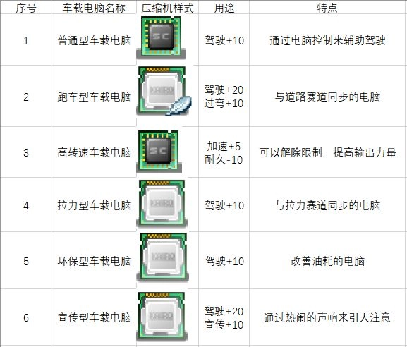 车载摄像头:分析的效率上升。乍一看没什么用,但考虑到游戏中需要用到研究数据的地方非常多,而安装车载摄像头后,在比赛中技术点的增加速度会比平常状态更快。