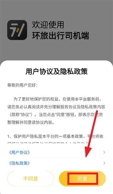 安装并打开环旅出行司机端,先同意用户协议及隐私政策