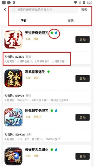 4、选择“礼包”,可以看到所有有礼包的游戏以及玩家正在玩的游戏,顶端还可以搜索想要查询的游戏礼包;在游戏名称的下方还可以礼包码方便玩家兑换礼包,礼包内容也告诉大家了,游戏支持安卓还是苹果平台也给玩家标注好了;