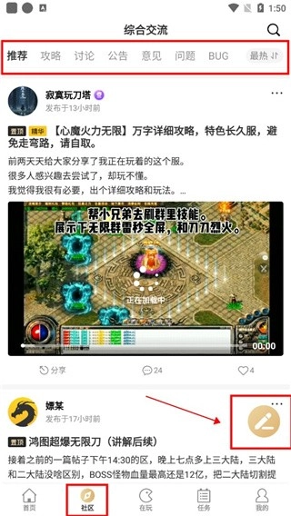 9、选择底部的“社区”板块,这里也有详细的社区讨论分类,攻略、公告、意见等等,选择右下角的编辑功能就可以在这里发布个人讨论了;