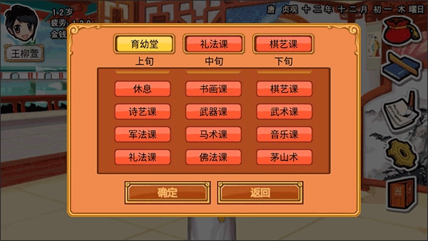 以下可以简单教教大家怎样快速增加属性值和声望值。 先是育幼堂,一直干到魅力和亲和力达到标准。 接着是礼法课,一直上到气质和礼仪达到标准。 然后是棋艺课,一直到自信达到标准。