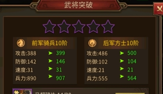 武将品阶提升可增加兵种基础属性,继而提升武将战斗力。