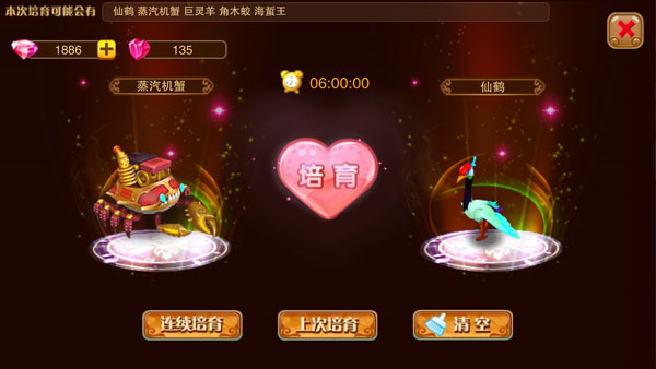 1、培育:要是你玩过《全民精灵》这类养成类游戏,那建议你通过培育来获取神兽。把两只不同元素的2阶神兽放进培育池,让它们两两交配,就有机会培育出新神兽。在此,跟大家分享个小窍门:选好神兽后,点击“连续培育”就能查看培育结果,还能从结果里挑选一种作为培育目标呢。要是你对参与培育的神兽组合心里没底,别着急,打开图鉴,找到对应的神兽,就能看到推荐的培育方法啦。