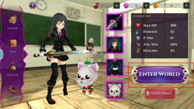 1、玩家在本站下载并安装好游戏后,打开游戏。进入游戏界面,既可以点击右下角的紫色按钮进入世界,也能直接点击左上角的【school】达成同样效果。此外,界面下方设有困难模式(红色按钮),玩家不妨一试。