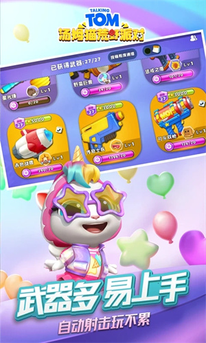 武器多多,狙击枪、引擎发动机、充气捶捶等多种武器任君选择,打击感十足,瞄准对手即可自动攻击,操作简便易上手