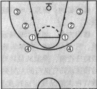 练习方式:把全队平均分成人数一样的两组,分别在两个半场进行投篮练习。就像图中展示的那样,每组要在图中标注的4个位置依次连续投篮,每个位置都需投中50个球。投篮位置的先后顺序是:① - ② - ③ - ④ 。最先投中50个球的小组获胜。每组配备3个球,队员投篮后要迅速冲抢篮板,然后将球传给另一排的队员,之后跑到该排的队尾。