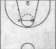 练习方法:如图所示,投篮点为场地中任意 A、B两点,要求尽可能快速地从A移动到B接球投篮,在30秒钟时间内投中8个2分球或6个3分球。