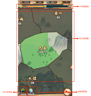 1、资源栏:展示门派基本资源数量,每个界面的资源栏展示物品可能不同,可点击查看和操作。
