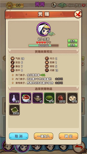 3、初入宗门:点击可查看弟子在宗门的地位以及赏赐效果预览。(同赏赐按钮进入界面一致)