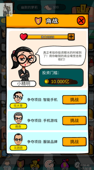 3、当你积累到了一定的财富为了能更好的登上更好位置的排行榜,可以去和其他老板一样参加商战。