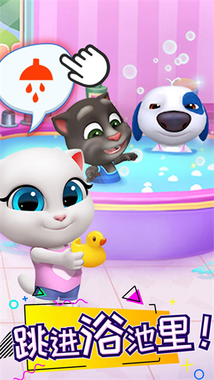 2、点击“会说话的汤姆猫家族”六位成员头顶的图标,可以喂它们吃饭,给它们洗澡。你一定会成为一个最好的主人,而它们也会成为你的最好的宠物伙伴。