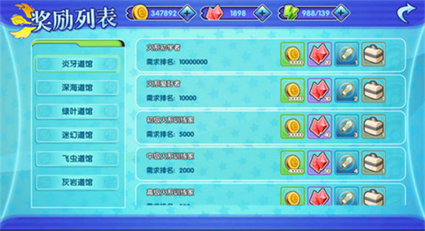 4、属性天梯赛:每天开放不同属性的天梯赛,通过不断提高排名获取各种道馆称谓,还能领取丰富的排名奖励,六大属性道馆,五十四个道馆称谓,大量的金币滚滚而来。