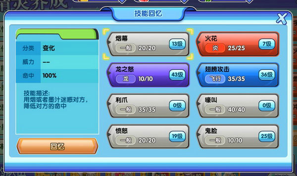 通过自身技能界面,玩家能够知道当前精灵可以依据等级学到的所有技能,也可以替换新技能和回忆旧技能。