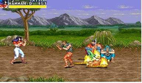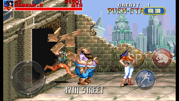 6、本关 BOSS 的第一形态行动十分灵活。具体打法是,要尽快杀掉最先出现的一个小兵,如此一来,便不会有其他小兵(特别是猴子兵)出来干扰。不然,哪怕只是两个小兵与灵活的 BOSS 协同对付你,心理素质欠佳的玩家必定会损失大量生命值。如此就能单挑 BOSS 的第一形态了。具体的完美操作方式为,将 BOSS 打到屏幕右端后,站在离最右端不远不近的位置,背向最右端持续按拳,这时会发现 BOSS 恰好跳到你按拳的地方,必定会被击中,接着打 3 拳后再把 BOSS 扔回到右端屏幕外,然后继续等待它跳回来……到了 BOSS 的第二形态,只需来回呈 8 字形跑动即可,无需多言。