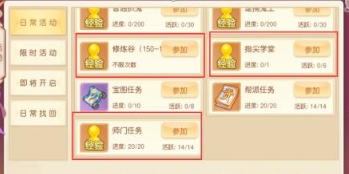 通过每日的活动任务,运镖任务和师门任务,也是可以获得大量的经验的,具体的可以通过点击日程图标,到日常活动和限时活动里查询
