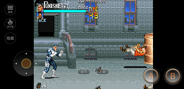 2、进入游戏后玩家将控制一名角色进行闯关,左边控制人物的移动方向,右边的A键控制攻击、拾取,B键跳跃;