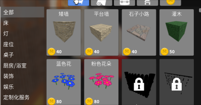 分别有床灯,座位桌子,厨房,浴室装饰,娱乐,定制,化服务,节日。另外我们还可以装饰自己的墙壁,可以用图书馆墙,水族馆墙,怪物墙,大理石墙,水果墙等等不同风格的壁纸。