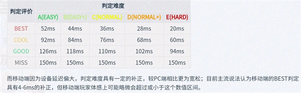 通常认为,表内数据为PC端的判定区间,而移动端的情况如以下文字所述:“存在4 - 6ms的补正……在体感上或许会稍高于或低于该区间” 。