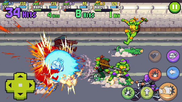 -与《忍者神龟》中的经典角色一同闯关,其中有忍者神龟英雄莱奥、拉夫、唐尼以及麦奇,你还能够选择新增游戏角色爱普、斯普林特师父或者凯西·琼斯!