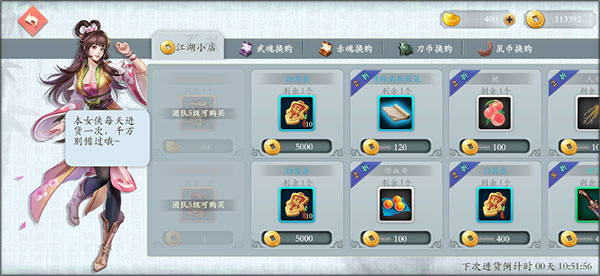 江湖小店就是我们认知中的杂货店,主要货币是金币,里面每天会刷新各种打折的材料和扫荡券,性价比极高,基本是每天必须扫荡一空的商店。