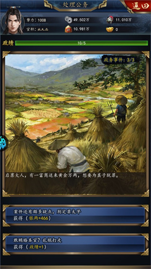 3、需要处理各种政务事务,如处理官员上书、调查官员贪污等。根据每个事件的不同,选择合适的解决方式,例如处罚、奖赏、重用等。