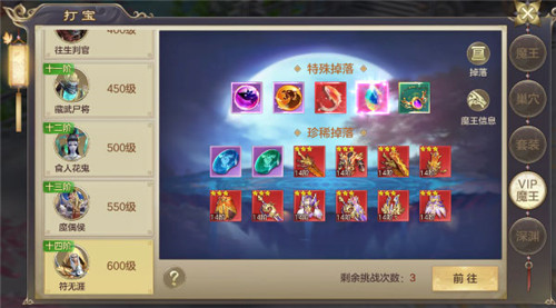 只有VIP4及以上的玩家,才可挑战VIP BOSS,挑战BOSS每次需要消耗2个魔王挑战册,VIPBOSS的奖励会更加丰厚,爆率也会比其他BOSS高,强烈推荐挑战哦!