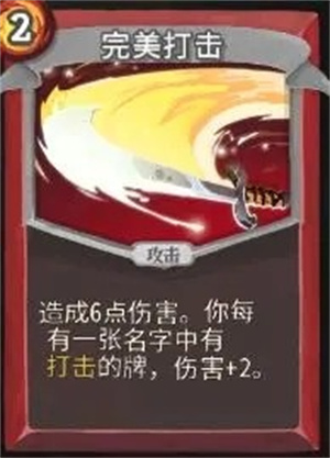 完美打击:与灼热打击类似,具备无限养成的特性。一旦选择这张牌决定玩完美打击流,后续就需始终挑选带有“打击”字样的卡牌。不过,存在牌库数量过多,导致难以抽到这张牌的情况,所以需要多选一些抽牌类卡牌来相互配合。