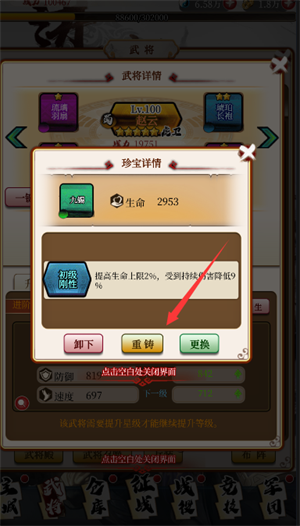 赵小云在这里需要提醒主公大人的注意事项就是,武将等级达到100级才可以装备珍宝哦~