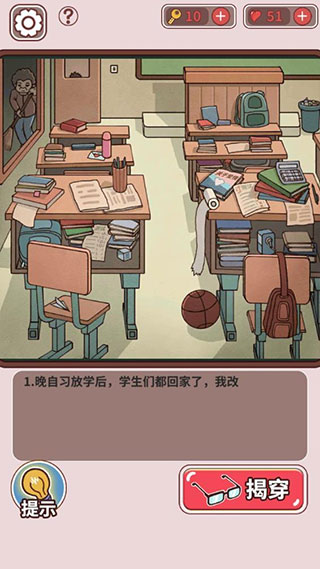 1在游戏里,系统会给出相应事件,作为班主任,我们得识破其中的谎言。要是找到了证据,点击对应的位置,再点击右下角的【揭穿】按钮,若回答正确,就能直接进入下一个内容。