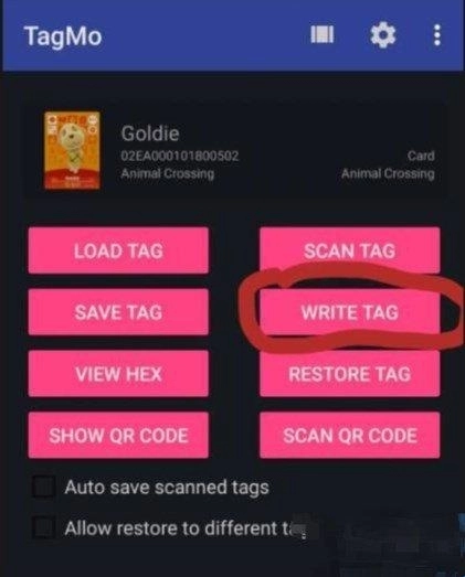 5、开启手机的NFC功能,点击“WRITE TAG”按钮,并将空白NFC卡贴近手机的感应区域,即可完成amiibo卡的制作。