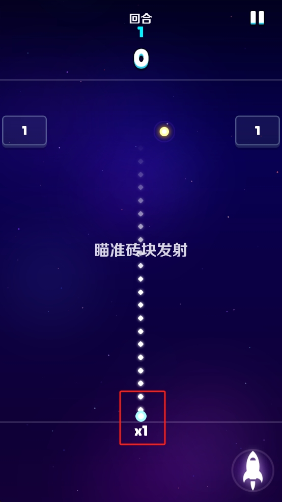 1、首先我们拖动底部蓝色小球瞄准上方砖块,调整发射角度,点击右下角火箭图标发射,借助弹道击碎砖块。