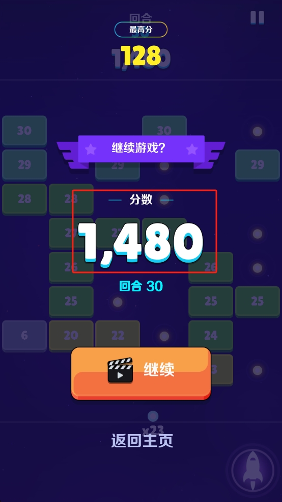 3、回合结束后,界面显示分数1480 ,可点击橙色继续按钮延续游戏或返回主页,若冲高分则利用反弹策略再战。
