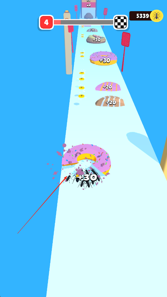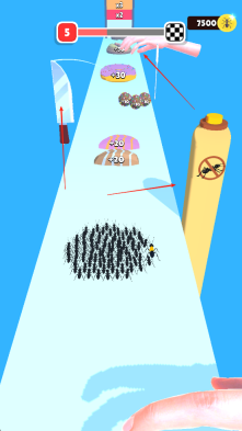 2、赛道上的危险陷阱逐渐增多,需移动蚂蚁堆避开杀虫剂、刀,手掌,或蚊子拍等,同时收集沿途食物,增大蚂蚁群的数量。