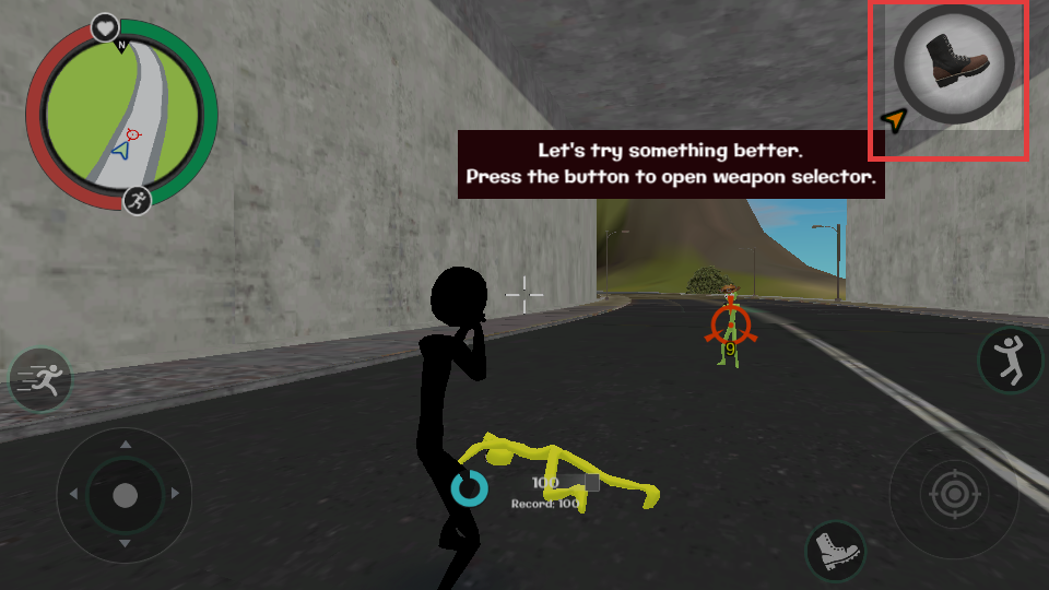 2、长按右侧攻击按钮,对黄色敌人发动近战攻击并击败它。