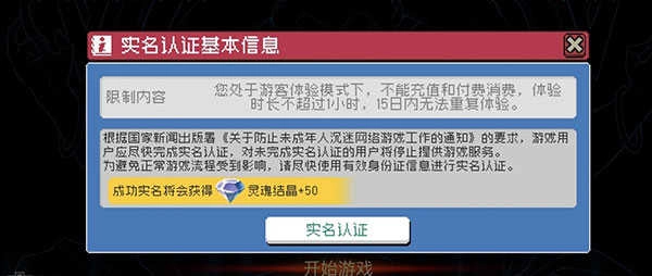 5、如未实名,则会弹出【实名认证基本信息】的提示(不同渠道弹出的实名认证窗口可能不同,请以实际显示为准)(响应国家实名政策,建议尽快进行实名认证,避免影响游戏体验)