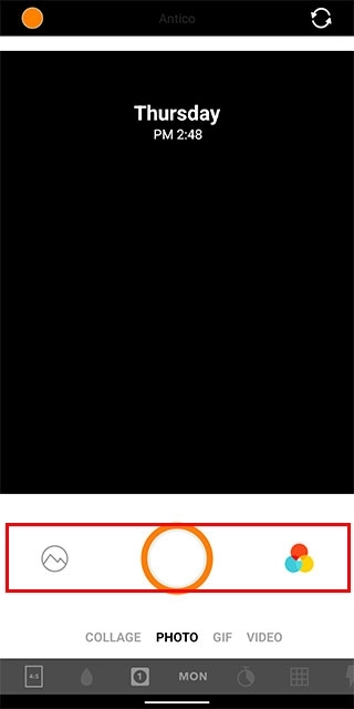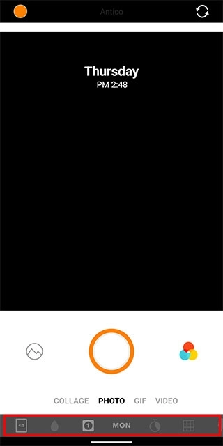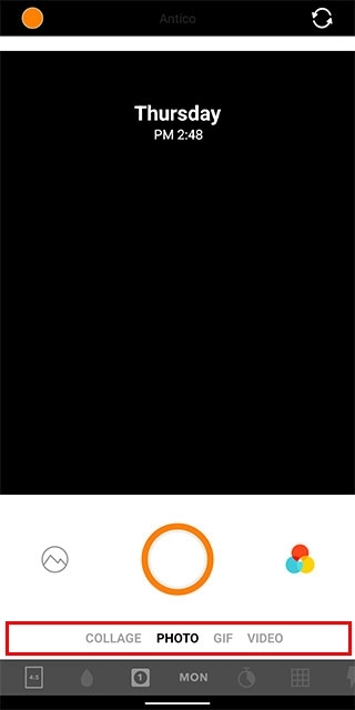 3、工具栏上方为拍摄模式切换区,从左至右分别为:拼贴连拍、普通拍照、GIF录制、视频拍摄,支持多种创意表达形式