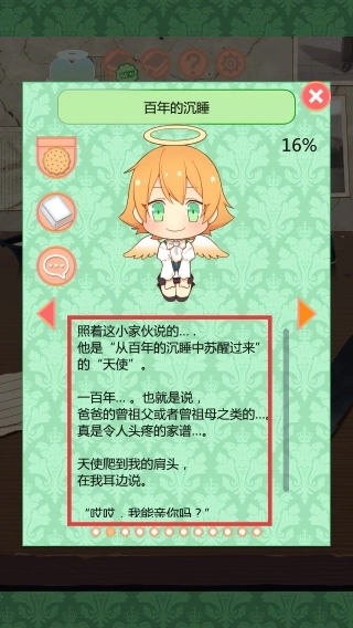 4、故事阅读互动:通过翻阅笔记本浏览故事梗概,查看天使成长情况,经验条满值后解锁新的剧情内容。