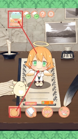 3、主界面点击【饼干】图标,积累经验提升【经验值条-32/100】,助力故事发展。
