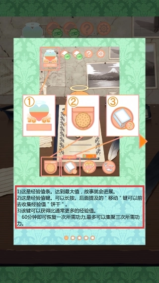 2、跟随教程熟悉【经验值条-50/100】【饼干】【书本】功能,掌握成长与剧情推进规则。